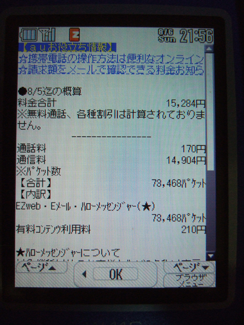 携帯をauのWINタイプに機種変更して、調子こいていろいろ遊んでいたら、一気にパケット消費量が跳ね上がってしまいました。まだ8月始まってばっかりなのに、料金が1万5千円!
