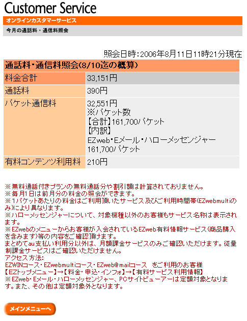 パケット割引が効いてないとさすがにシャレにならんので、今日お客様センターに電話して割引計算後の金額をこっそり聞いてみました。そしたら、8月10日時点で6,910円なんだって。