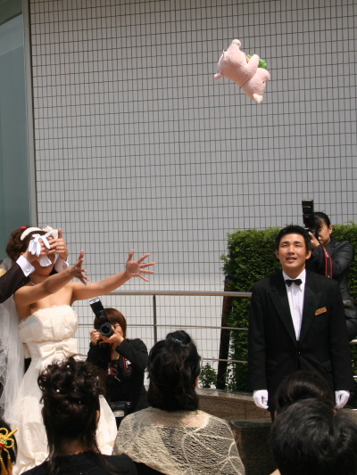日常 友人の結婚式 Author yuki Date 2009年4月25日 4月12日、大学の友人の結婚式に招かれて参加してきました。 ご結婚、おめでとうございます。 さて、ブーケ投げのブーケの代わりに人形を投げてたところを・・・(笑)