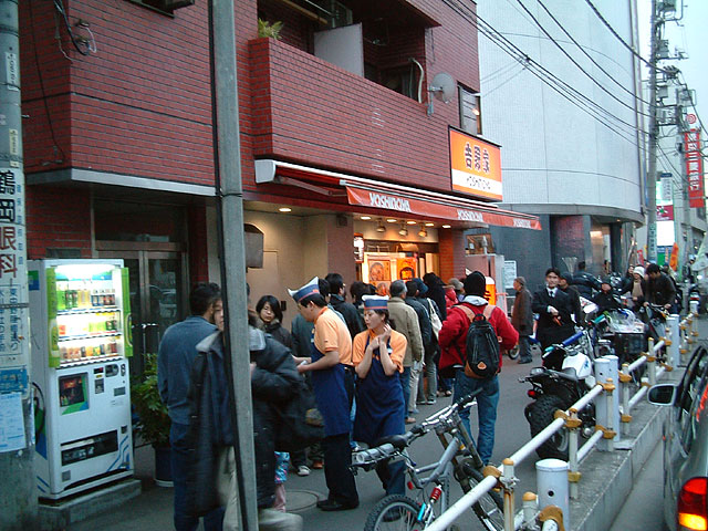 吉野家 2.11 Author yuki Date 2005年2月11日 Comments: 1 Comment 吉野家から牛丼が消滅してから1年が経った今日、牛丼が1日限定で復活しました。 少し前まで、かなりの勢いで吉牛に通っていた僕ですが、 「2月11日吉牛いく?」と聞かれたら、Noでした。 というのは、絶対に混むからです。 案の定、夕方吉牛の前を通りかかってみるとこんな感じでした。